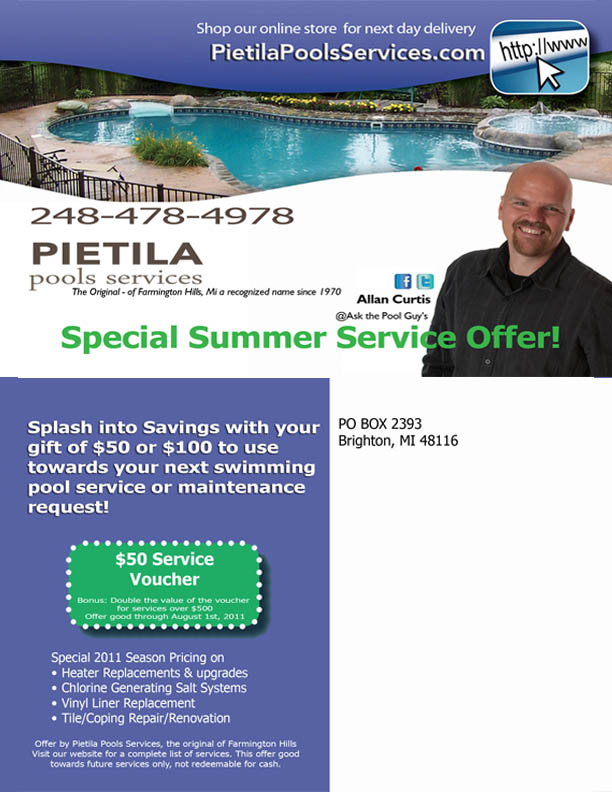 If you need any service this year on your inground swimming pool, we have a special savings certificate for you! *If you are not on our email list, sign up on the right. **If you would like to be on our official USPS mailing list for special offers and incentives, please send an email with your information to: info@pietilapoolsservices.com and we’ll get you on the list!