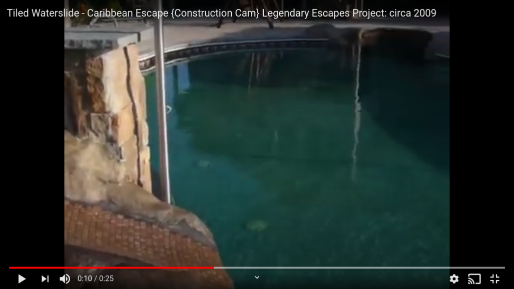 Here, our construction cam focuses on the tiled water slide in this Caribbean Escape pool project by Legendary Escapes.
