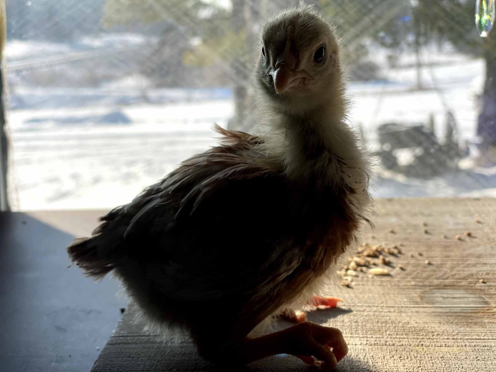 Here is a very adolescent looking isa brown chick having some sun time on the window sill. Frigid temperatures outside, but cozy and fun in the sun inside!