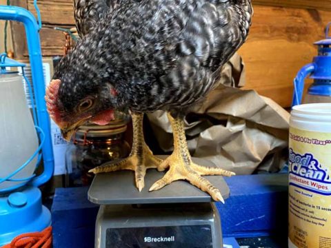 Melba tops the scale of our chicken flock weighing in at 3# .9 ounces. Compare that to Ebitz at a 1# .3oz, and Little big Bird at 2.0 ounces, and Tiny, our tiniest bantam weighing .7 ounces (smaller than a 1 ounce silver coin). That’s pretty tiny!