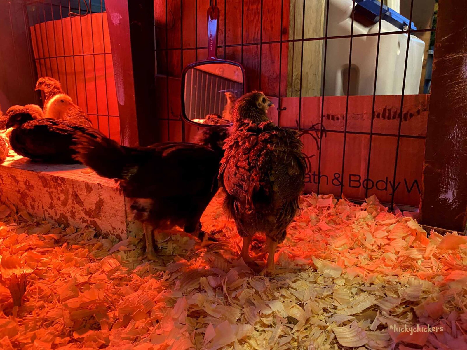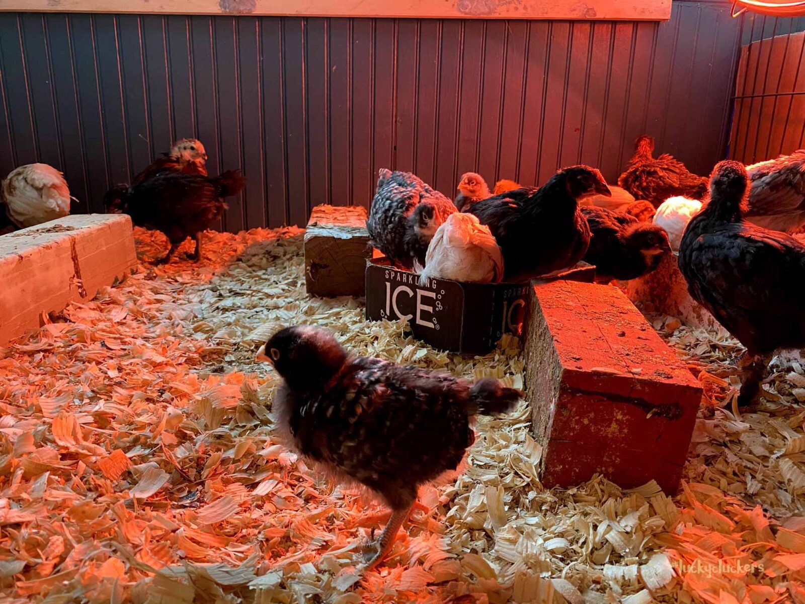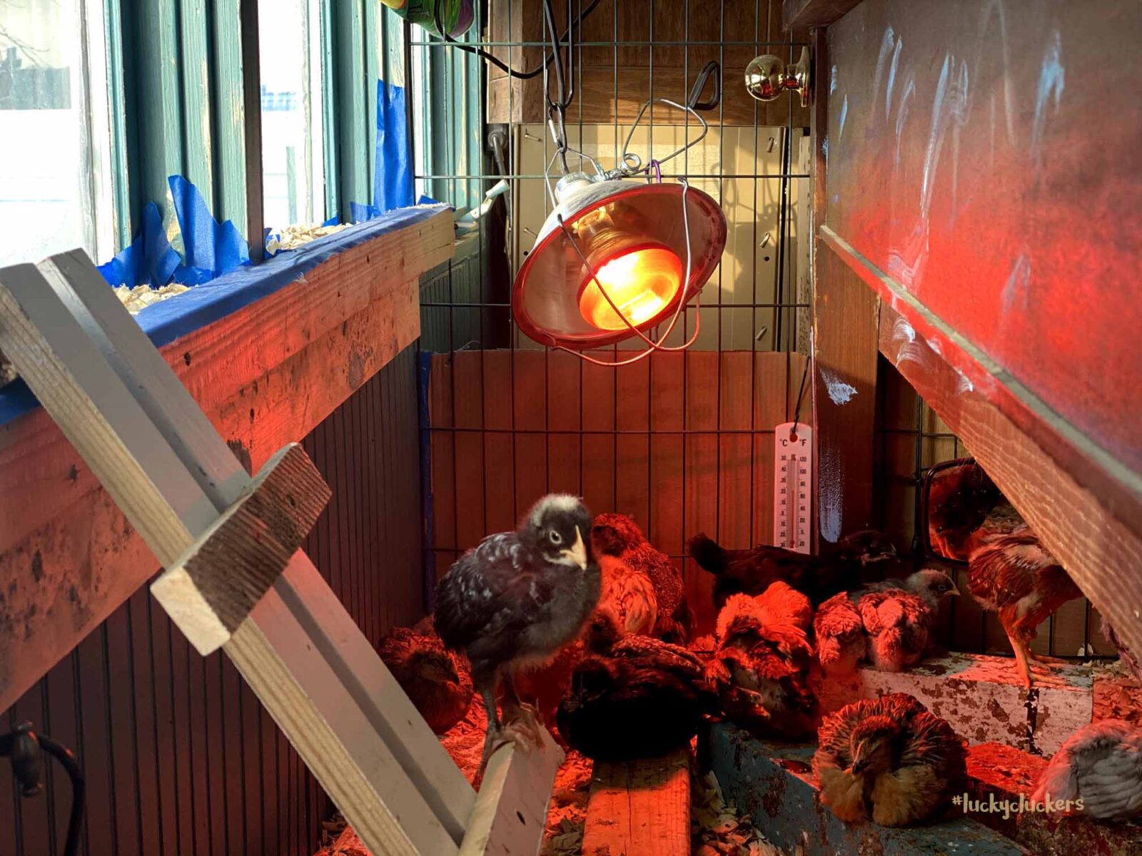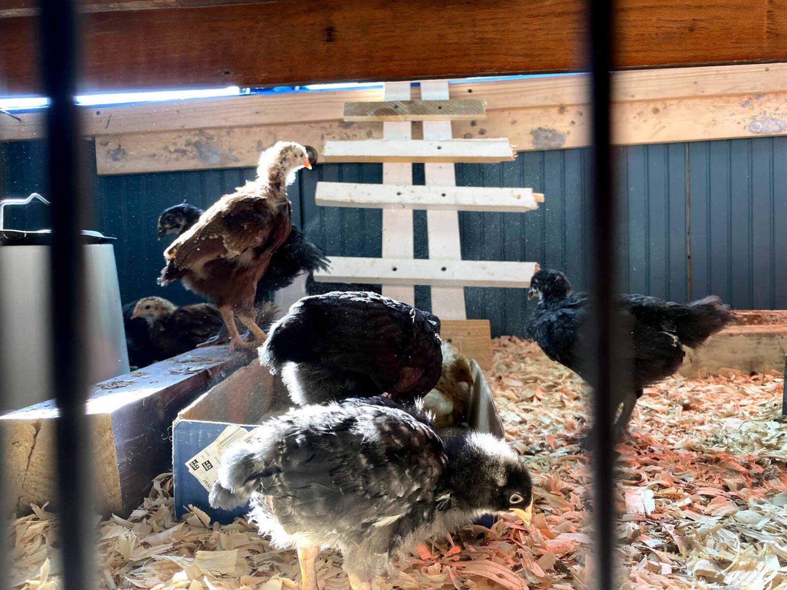 We’ve kept the red light on to keep them warm. They are now on the floor indoors, it can get a bit of cold air especially when the door opens. Our outside temps are in the teens and twenties this week, so even though they are old enough to start weaning off the light, it’s beneficial to have it there.