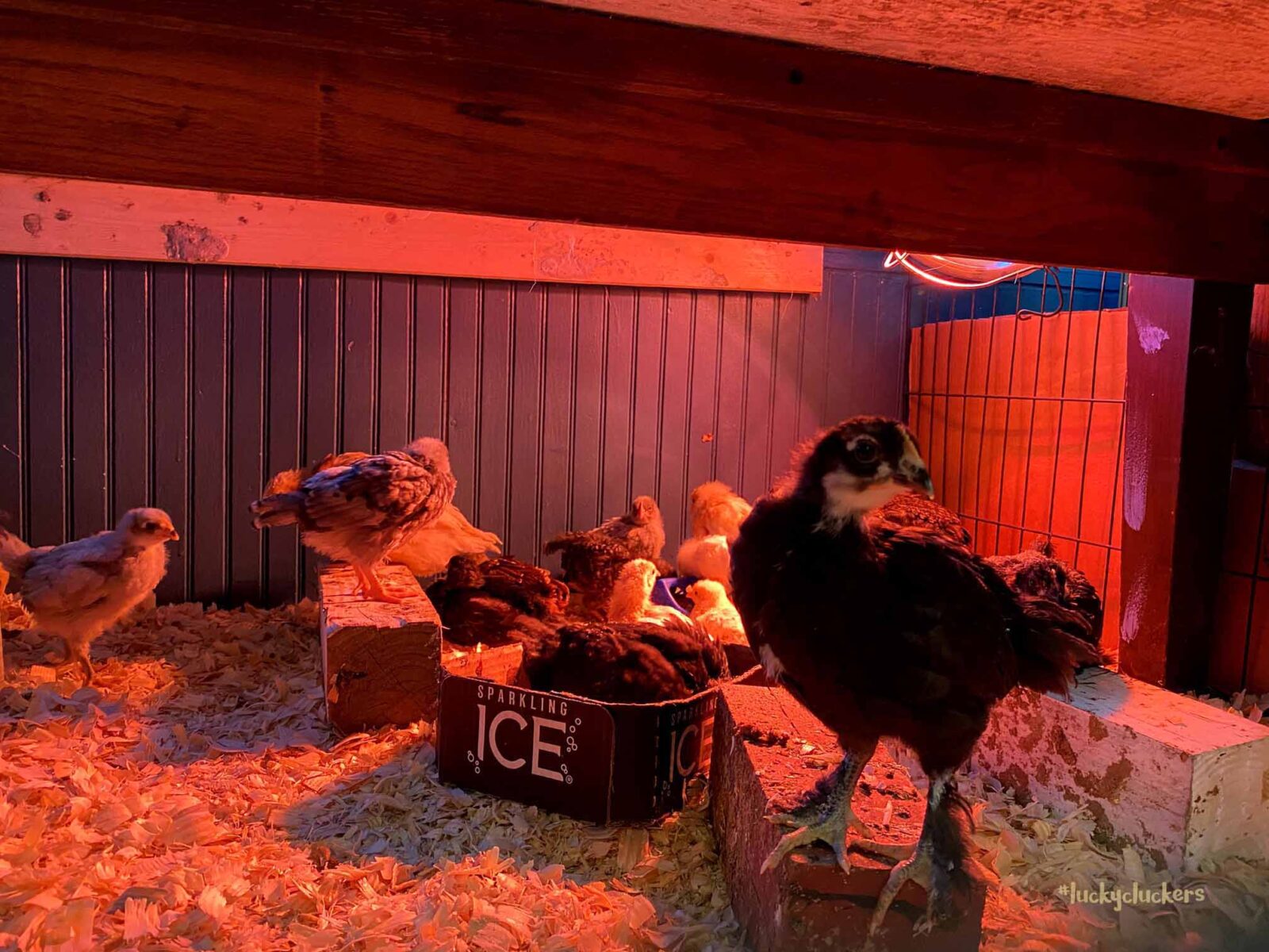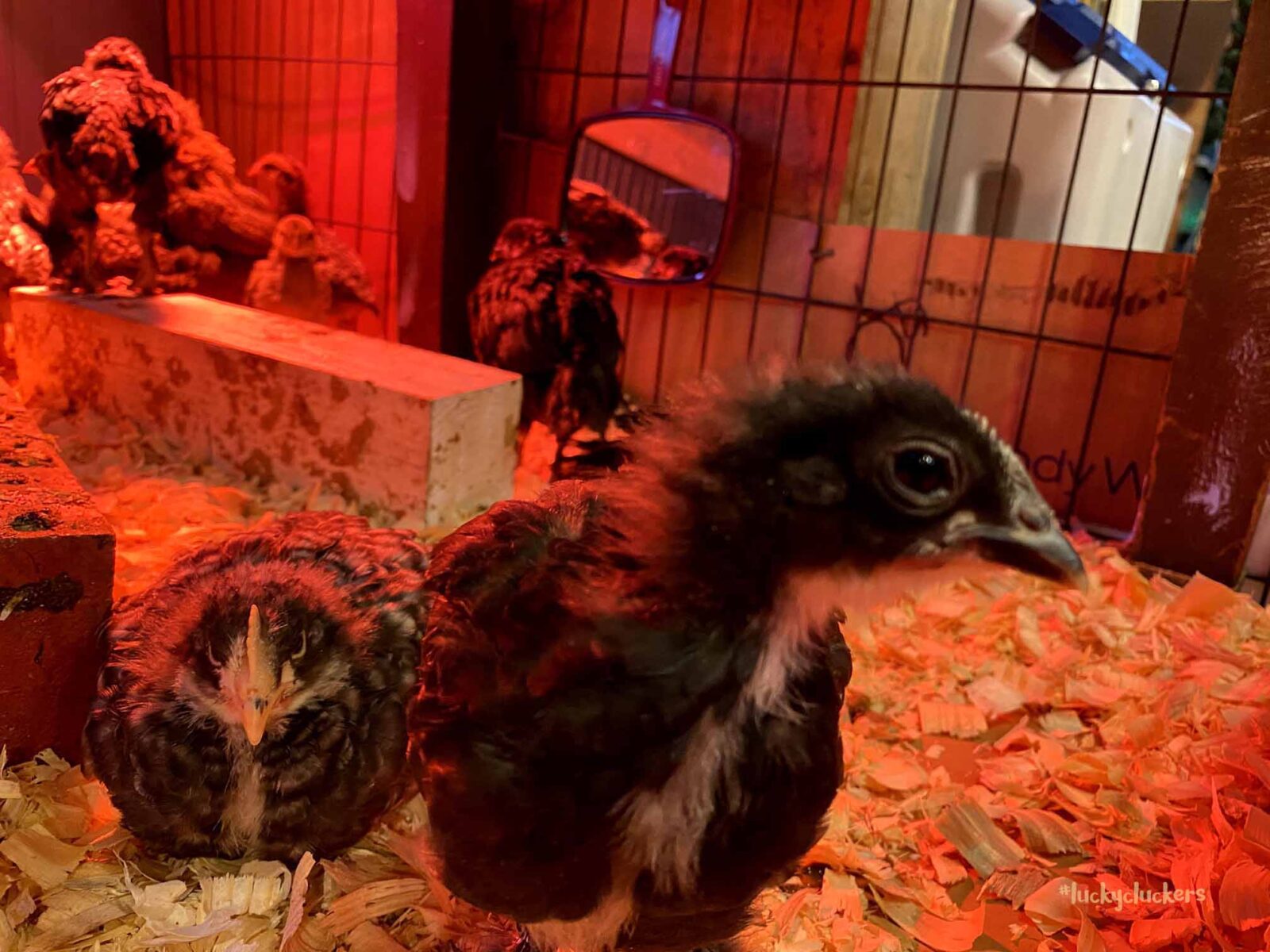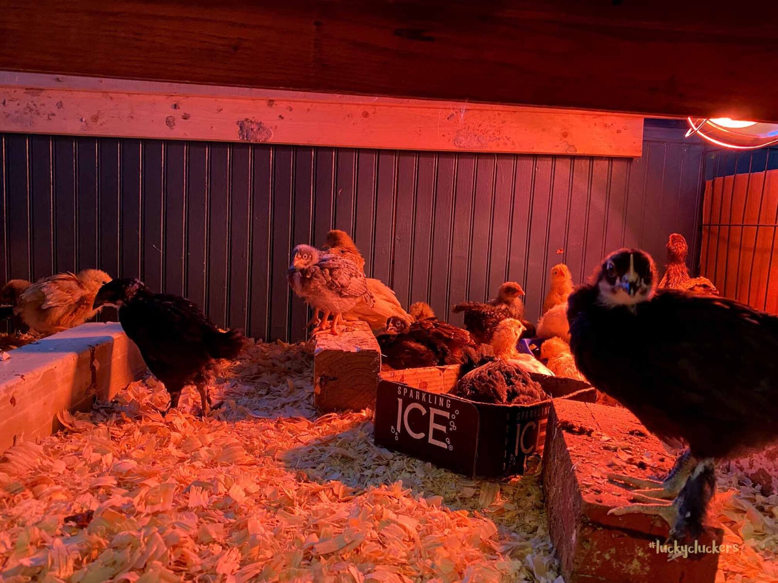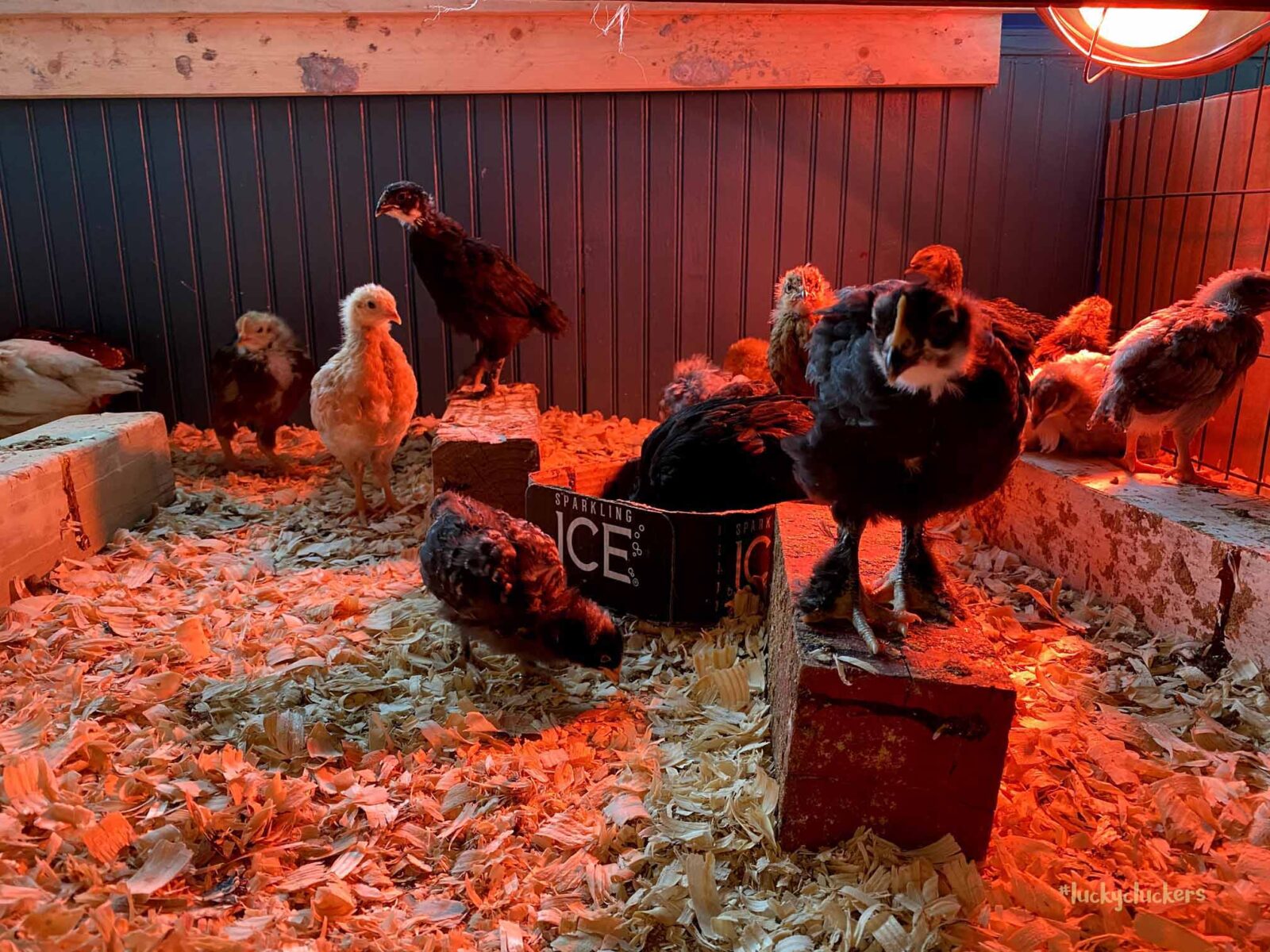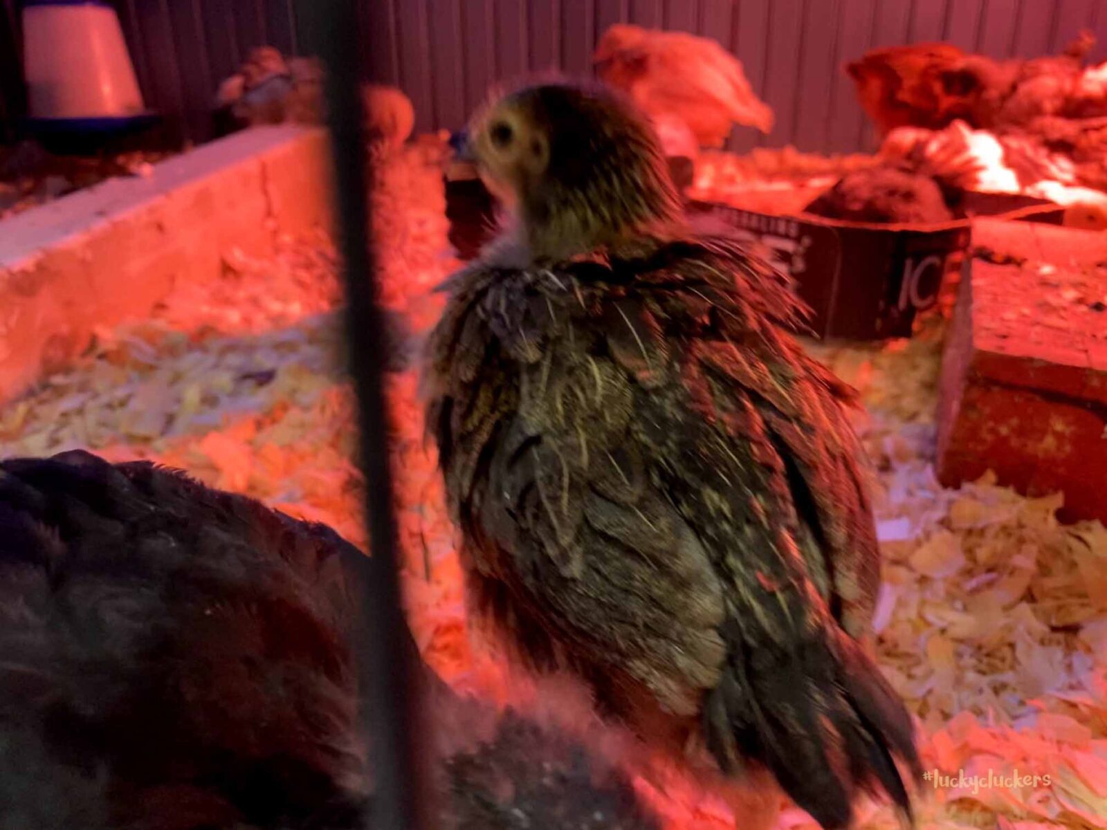 We’ve kept the red light on to keep them warm. They are now on the floor indoors, it can get a bit of cold air especially when the door opens. Our outside temps are in the teens and twenties this week, so even though they are old enough to start weaning off the light, it’s beneficial to have it there.