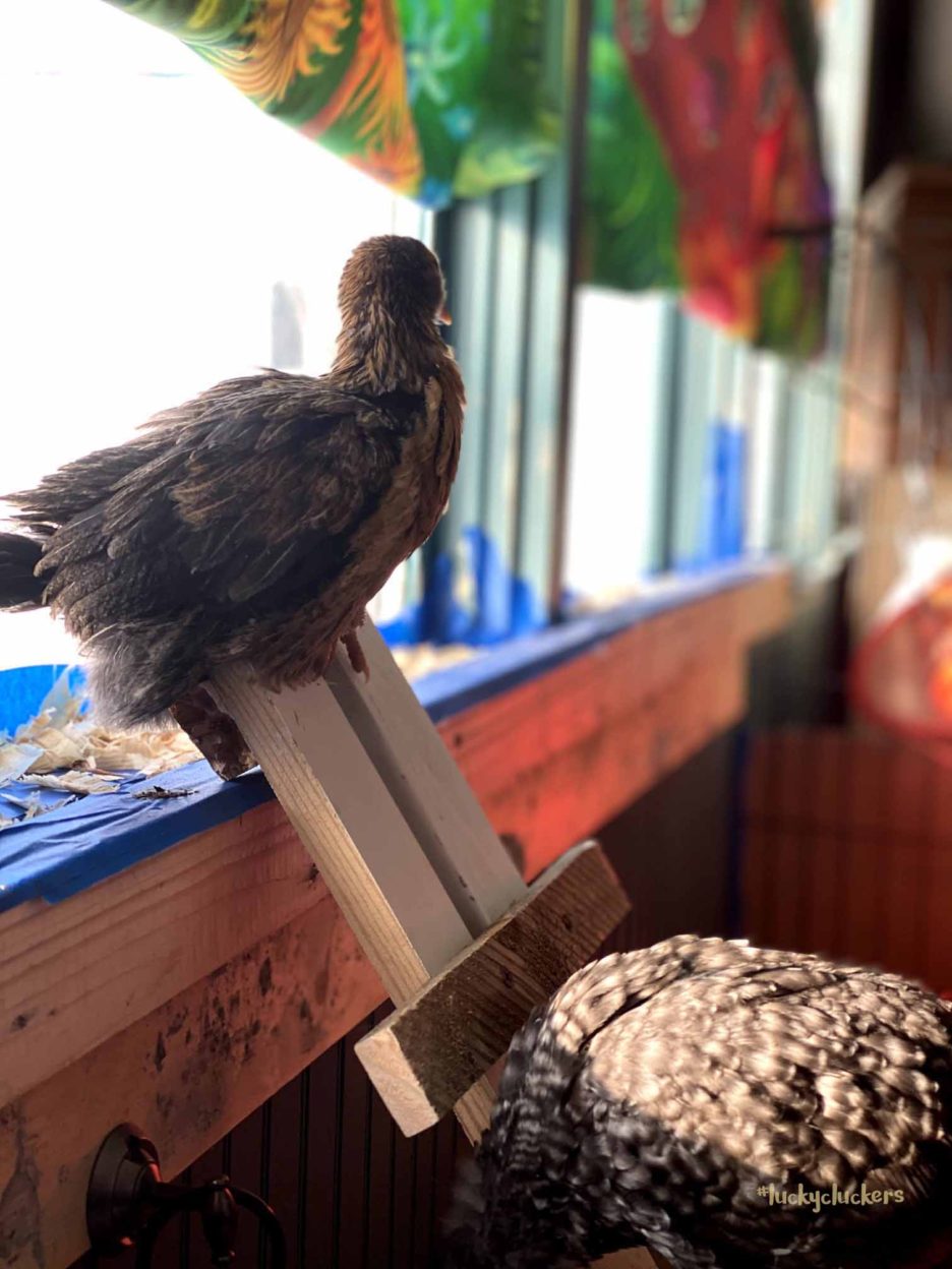 The chicks haven’t been able to look out the window yet either in their large metal watering trough they lived in for the last couple of weeks. This larger pen is next to the windows, so we added boards on the sill for roosting if they choose as well as a ladder (it was a couple of treads short the first time), so they can climb up and down if they choose to. A few of them like the view to the outside world. Big Bird and Melba also like to roost on the ladder.