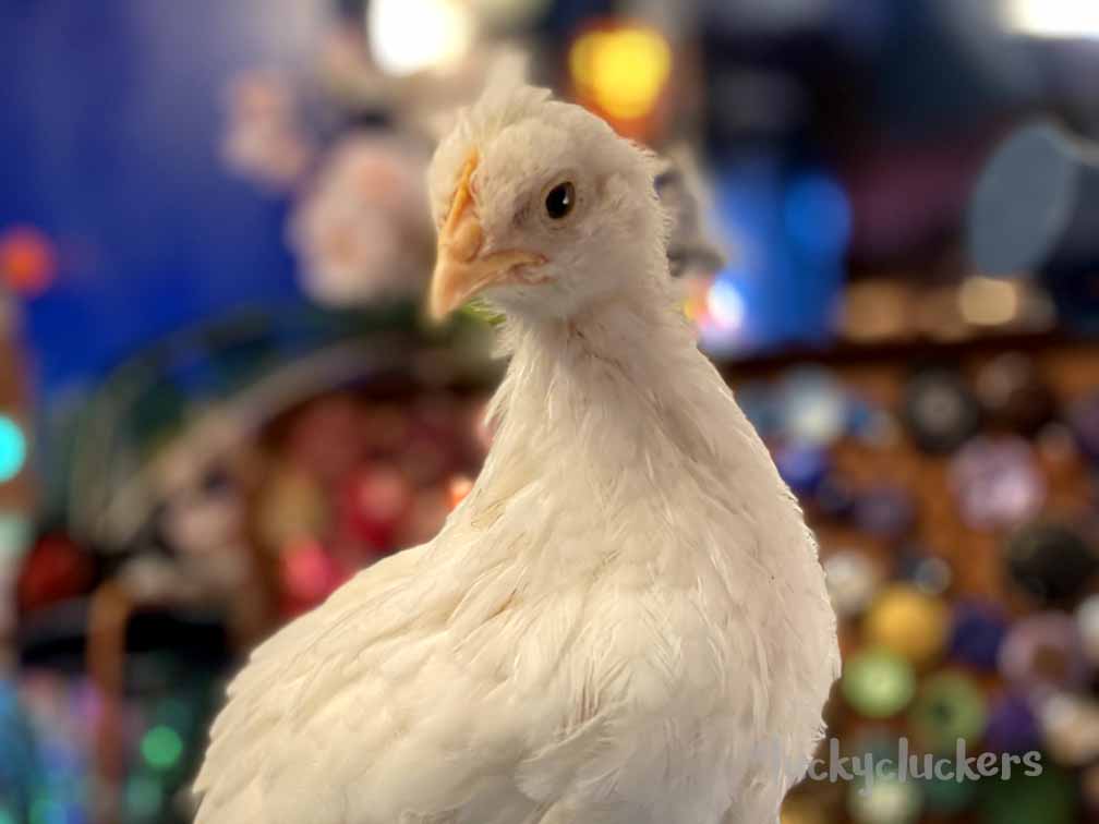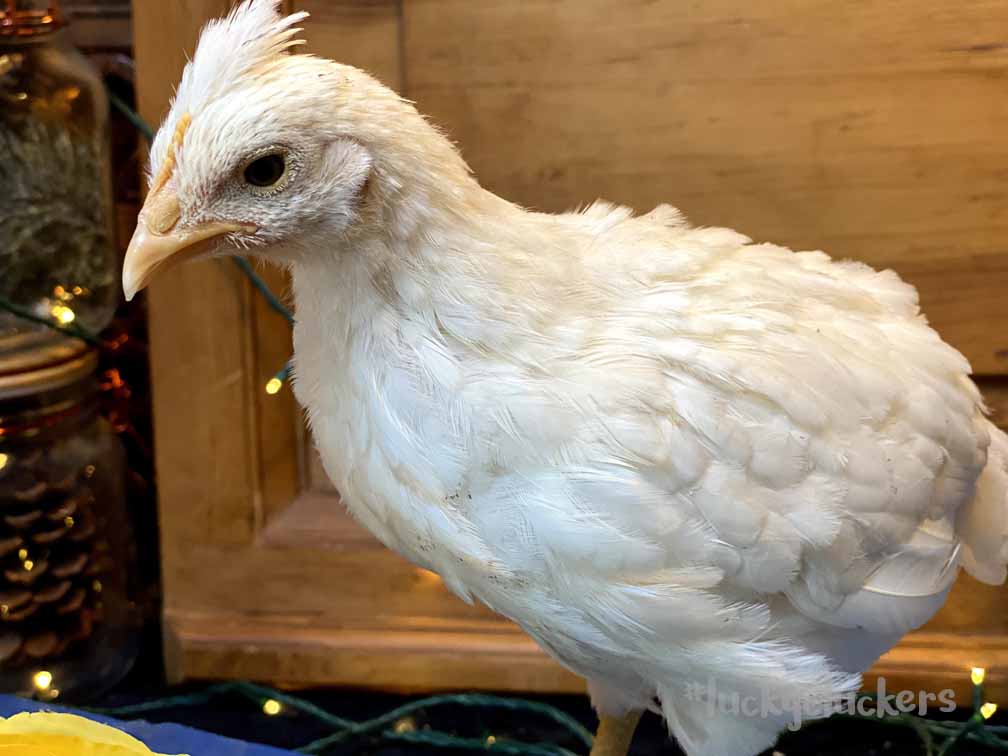 She is one of the prettiest and softest pullet chicks we have in the group. She’s becoming more friendly/sitting and being cuddled by us.