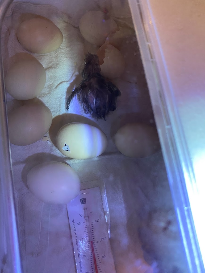 So, the best Christmas Gift this past year was an incubator! It was gifted to our Mother Clucker Sandi, however, she doesn’t have to be in charge of it just yet. Al – the gifter, has become the egg setter extraordinaire! Our first set was 41 eggs going in day 0, with 25 or so set in lockdown on day 18 – to 19 healthy new baby chicks! 17 of the 19 are bantams, with the last two a couple of small eggs added in from our new full size layer chickens – resulting in two chicks that are clearly our rooster Melba’s children!