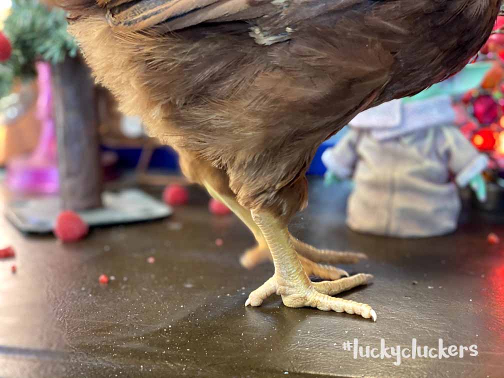 Henrietta has gotten extra attention since a week or so old. We noticed she walked a bit funny, and had a crooked leg (splayed leg?) or just a twisted leg injury? We did attempt the rubber band straightening, but didn’t like having to wrap her leg with something (she was growing so fast almost overnight it seemed too tight). We took it off, and she seemed to get around okay so we left it alone.