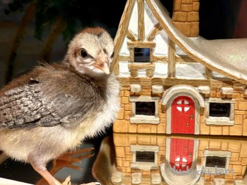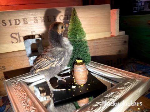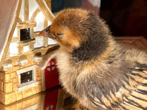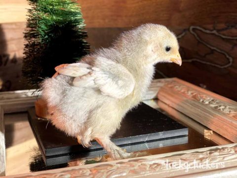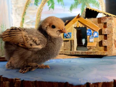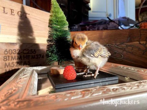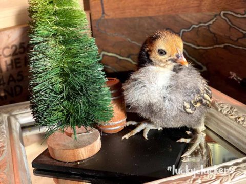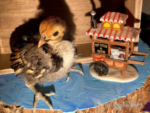Last but not least, here’s Martha – the grey/super light colored, feather footed bantam chick. Assuming she a “The Porcelain d’Uccle” which originates in Belgium. They have beards, feathered legs, and their plumage is a beautiful blueish-white that almost seems iridescent and all feathers are tipped in white. They have…