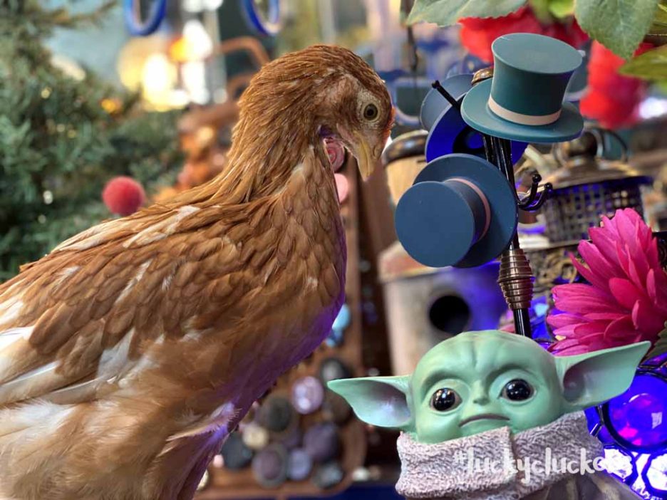 Butterscotch also posed with #babyyoda for these pics. It’s been fun to add props to the photo shoots to see just how much and how quickly our pullet chicks have grown! These ladies are approx 7 weeks old in this photo shoot series.
