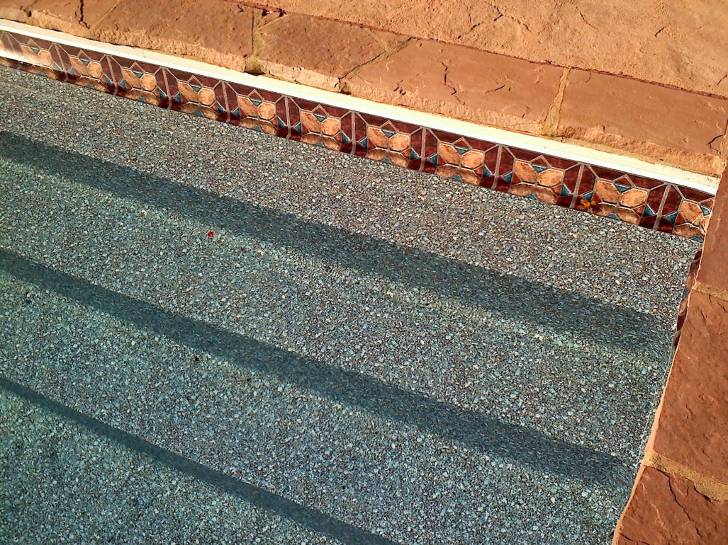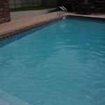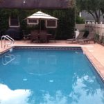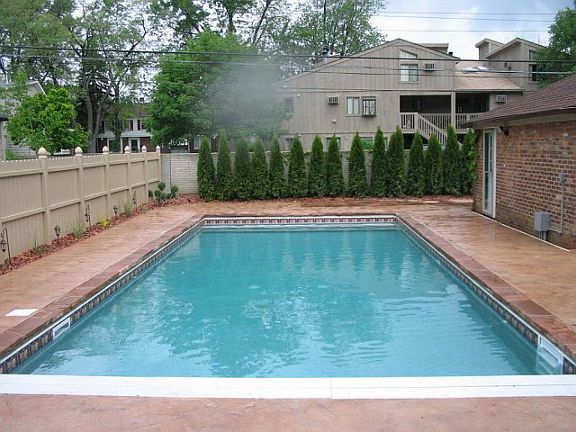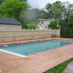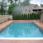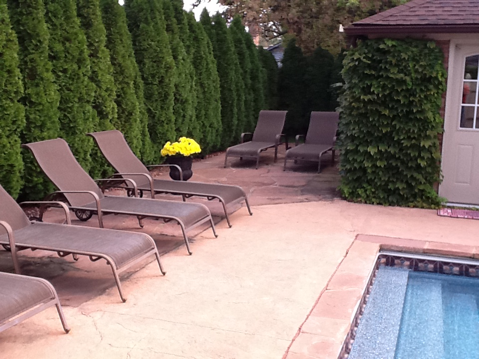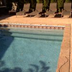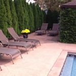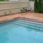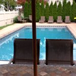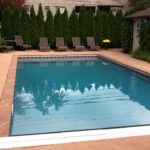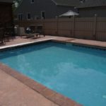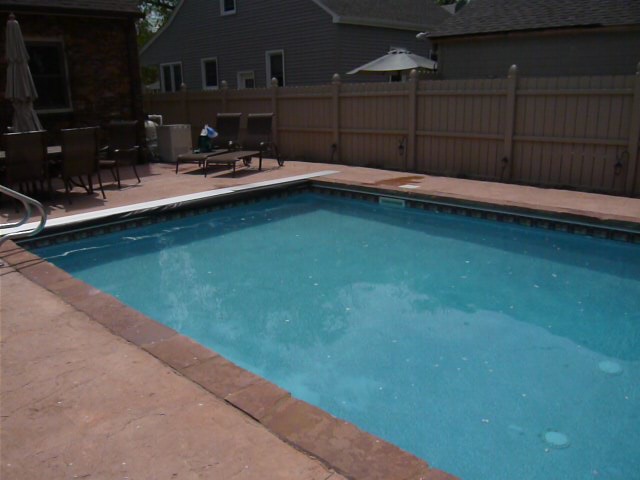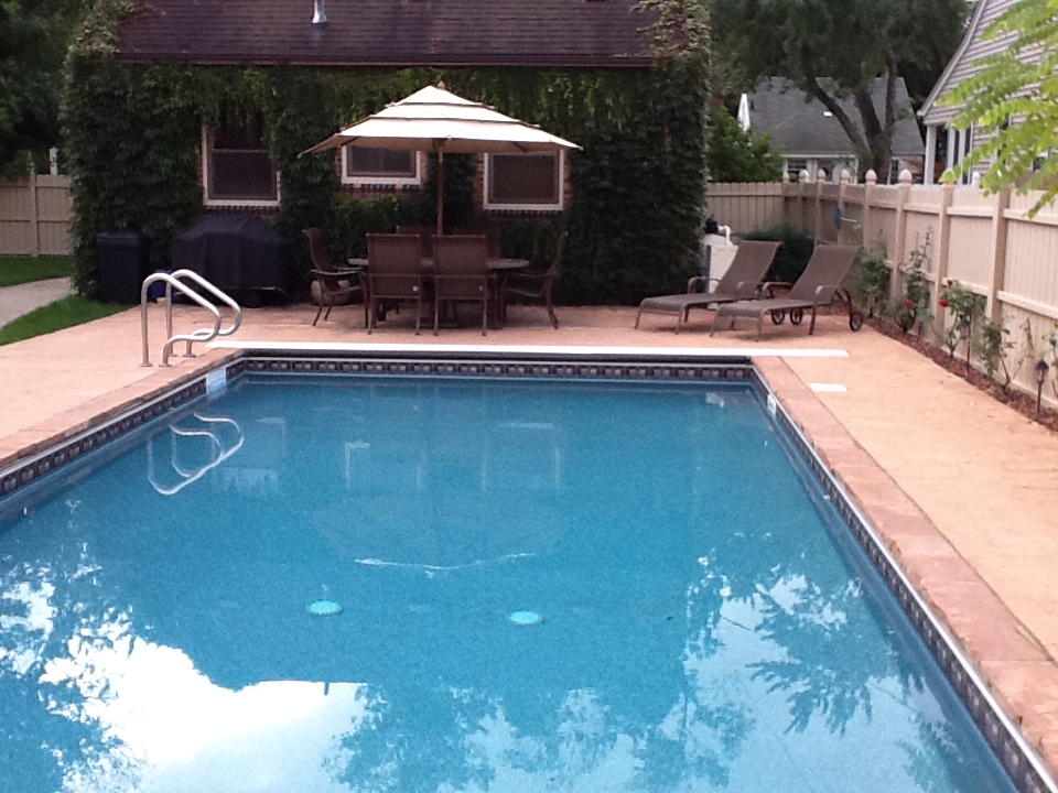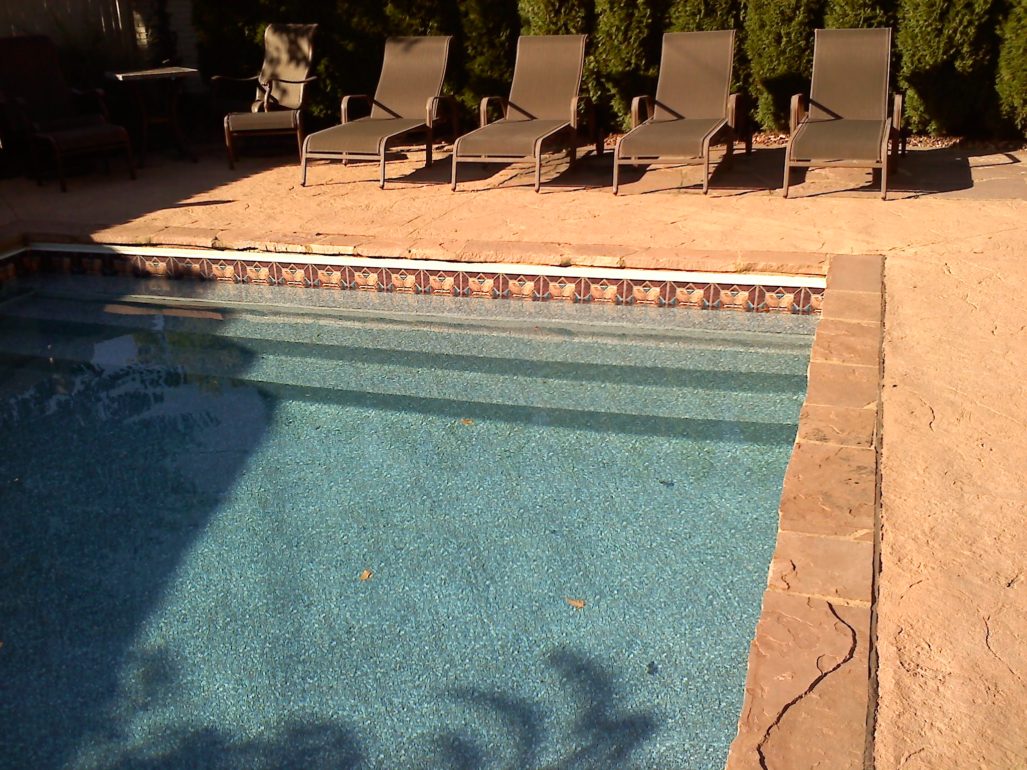 A southwestern feel was the goal for this custom backyard pool design in Berkley, Mi. The homeowner wanted a sport pool (depth gets no deeper than 5′) for sports in the pool, including volleyball. The patio was poured and colored/textured with a red/tan finish to accent the stone coping which was selected with the same considerations. The pool features steps along the entire shallow end of the pool, which were constructed out of poured concrete and covered in vinyl. The pool has an automatic pool cover (in a dark chocolate brown – which you should really consider if you are doing an automatic cover – it really helps to hide the dirt and debris, which will settle on your cover when it’s in use.) The pool equipment is Pentair, and this pool features a salt generating system (Intellichlor) by Pentair. The pool requires little maintenance – and the homeowner uses a Dolphin Pool Cleaner, as well as has the water chemistry tested regularly to ensure an optimum balance. Pools with automatic covers that have chlorine generators will typically not need to produce as much chlorine to keep the pool sanitized since the cover helps to keep the sunlight off of the pool, reducing the chlorine that is rendered useless by the sun. Make sure that you check your chlorine (Cl2) output if you have an automatic cover to ensure you are sanitizing adequately, and not over producing your chlorine.