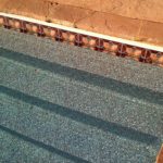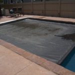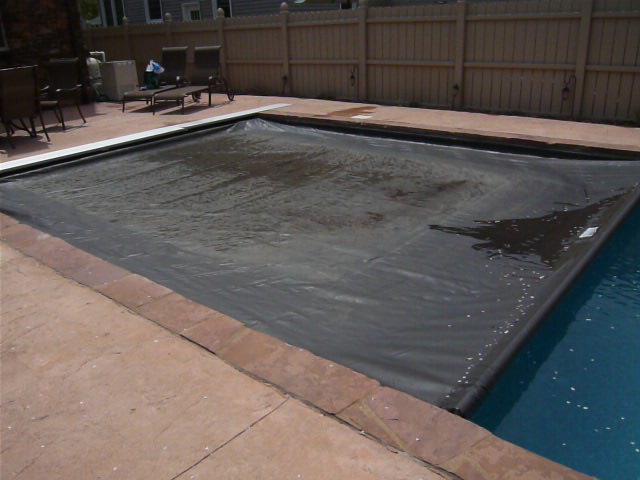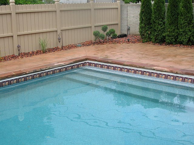 Rectangle Vinyl Liner Pool with Auto Cover, vinyl covered steps across shallow end of pool, red flagstone coping.