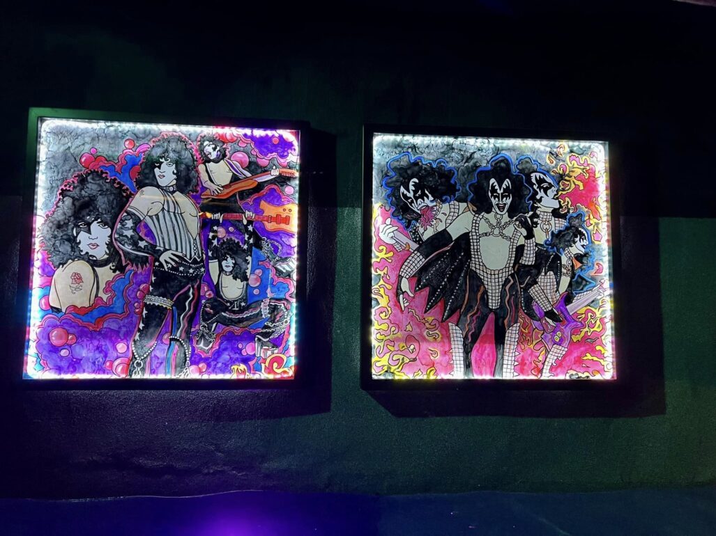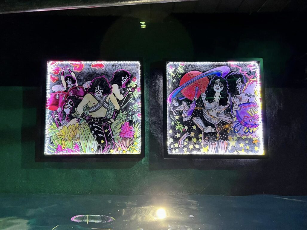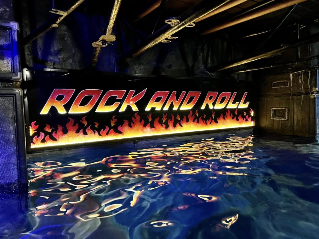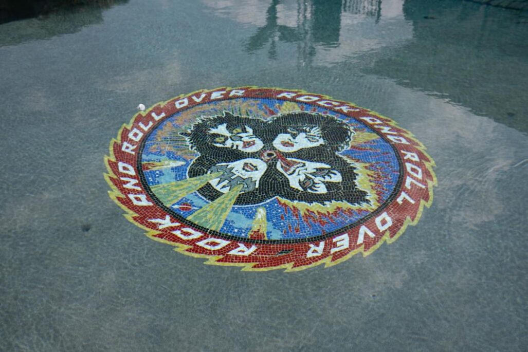 The equipment systems that run this pool are all automated, and situated behind the stage. There are dedicated systems for the pool and spa circulation, a pool heater and a heat pump, IC60 Salt Chlorine Generators by Pentair, and a separate set of pumps for the waterfall and sheer decent stage features. The pool is heated from the bottom with an automatic in-floor heating/cleaning/efficiency system. Custom Fabricated Steel Guitars create the immense “Lit” guitar fire features. These custom steel guitars are also controlled with the same Pentair ScreenLogic app for turning on and off the gas/flame fire feature. The app also controls the in-pool lighting accomplished with Zodiac lighting, and the patio lighting up the 6′ tall guitars, created by Daren Baker of db Designs, adorning the fence posts. Deanna Baker the other half of db Designs is the artist responsible for the incredible mural on the floor of the pool, as well as the light up/reverse painted images under the stage featuring Rock and Roll and the Kiss Album Covers.
