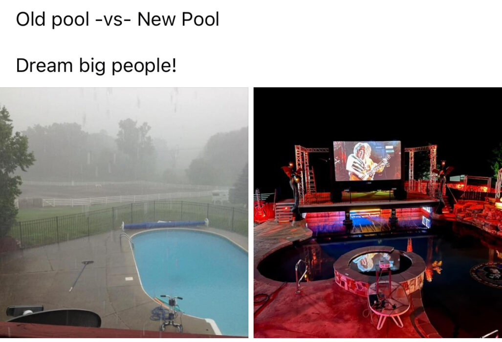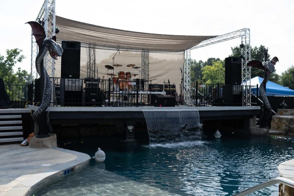The homeowner has entertained with a Swim In Showing of the movie “Jaws” after dark, and the inaugural KISS Cancer Goodbye benefit featuring Copperhead and Kore Rozzik on stage.