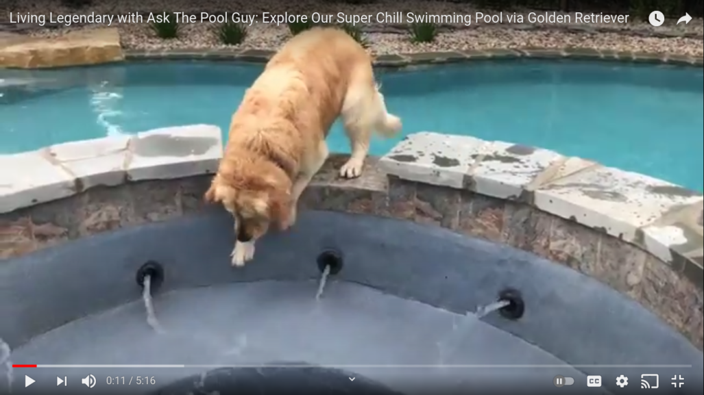 Explore this Legendary super chill swimming pool via Golden Retrievers. Watch as they play in this newly built hybrid swimming pool. The best of both worlds, vinyl and gunite! (and happy golden retrievers!)