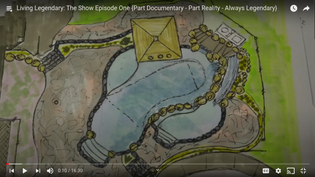 So, here we are. Paperwork permits bought and paid for ready to go. Now, we can go build the swimming pool. So, this is a hybrid pool. A hybrid pool is a vinyl liner pool … The main body of the water is vinyl with steel wall, vinyl liner, but then we do gunite accents. The sun shelf, the love seats, the waterfall are shot out of concrete. But, we have a kitchen are here. Over here we have a fairly simple pergola. Across, I’m going to step down to the patio here. The features: obviously the sun shelf. There’s a loveseat here. There’s a spitting turtle, a fire feature, and then this right here is the pirate ship. It’s like a shipwrecked pirate ship. The slide comes down the side. I imagine we’ll have water coming out of cannons on the front end and that type of thing there. And then, a step down area to a fire pit. This is indicating the bar area, so the whole bar area is this pirate themed kitchen, the bar area. And what we have currently painted on the ground is this inner shape of the swimming pool.
