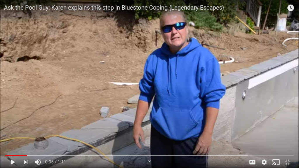 Karen explains how we use the bluestone coping and also how we reinforce it with concrete below. At the end you see her laying the bluestone down!