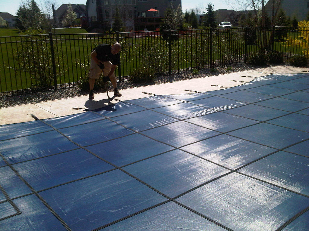 Using special tools, the crew (say hi to Rick!) will release the springs from the grommets that recess into the patio for summer. The cover is folded up for summer storage.